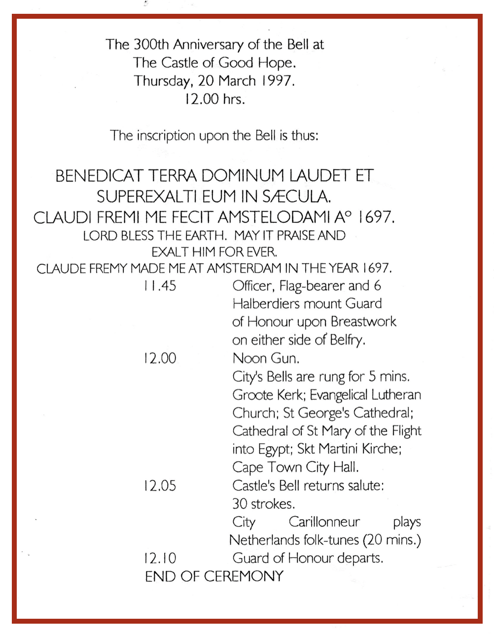 Die Stigting het in 1997 die 300-jaar herdenking van die kasteelklok gevier met 'n seremonie. Die program kan hieronder gesien word. Klik op die foto om 'n groot, volledige weergawe te sien.